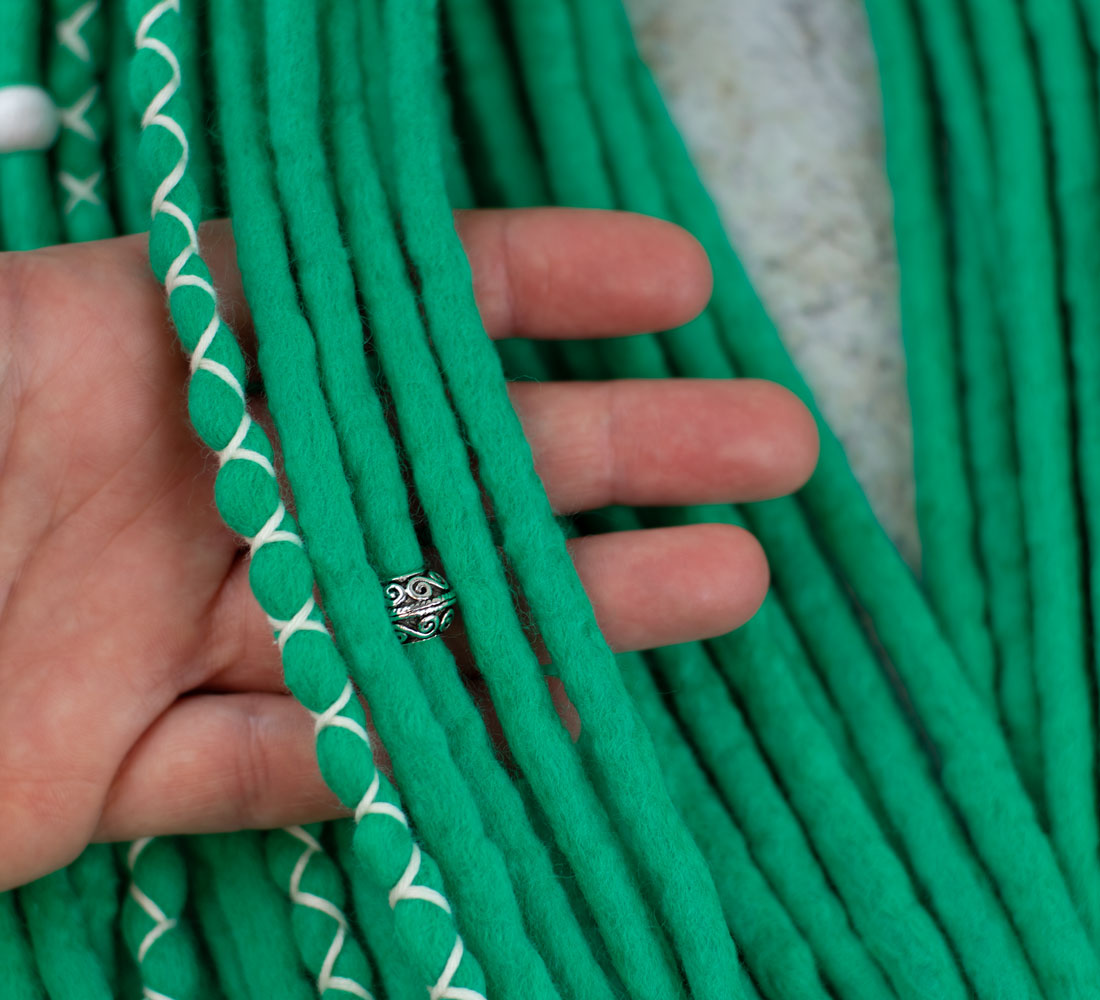 The mill dyed wool and yarn is toxic free, and complies with the OEKO-TEX 100 and GOTS requirements. We use high quality mulesing free extra fine merino wool for dreads. The dreadlocks are decorated with cotton yarn. We make the dreads with wet felting technique.