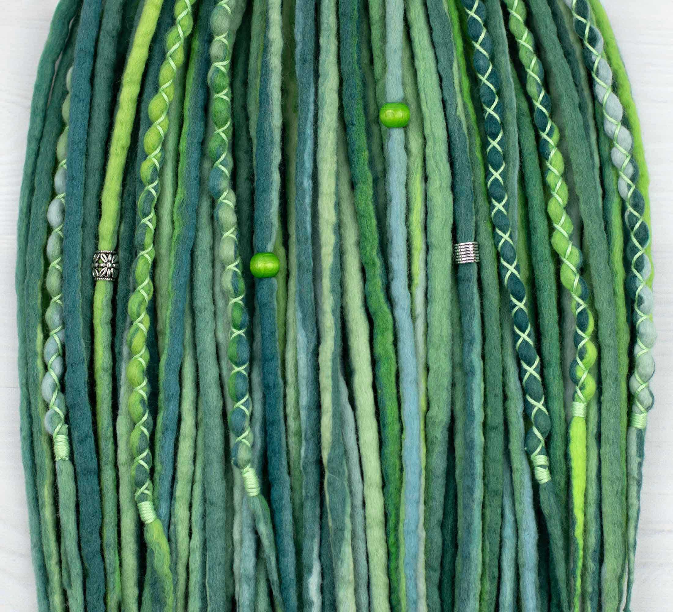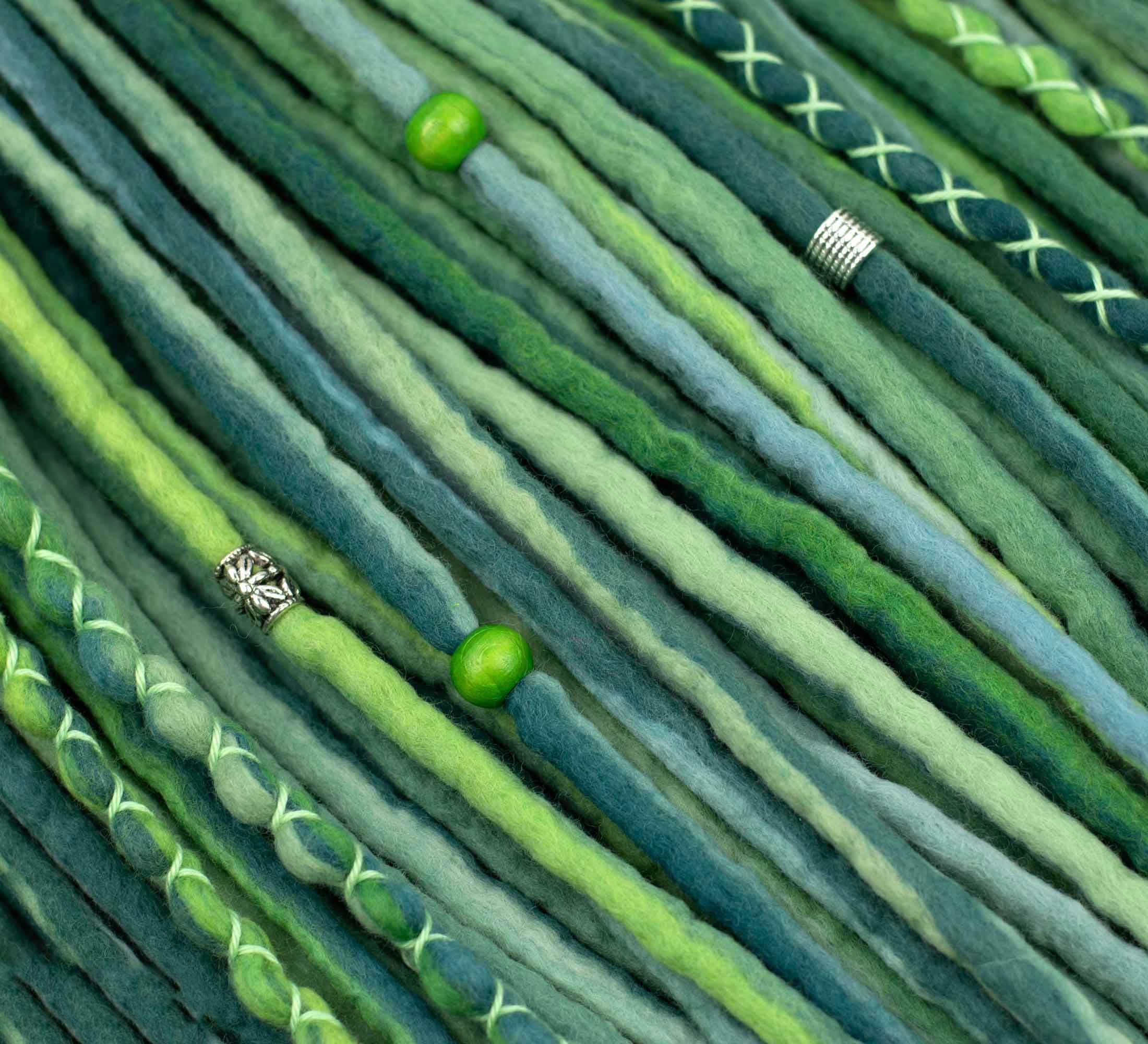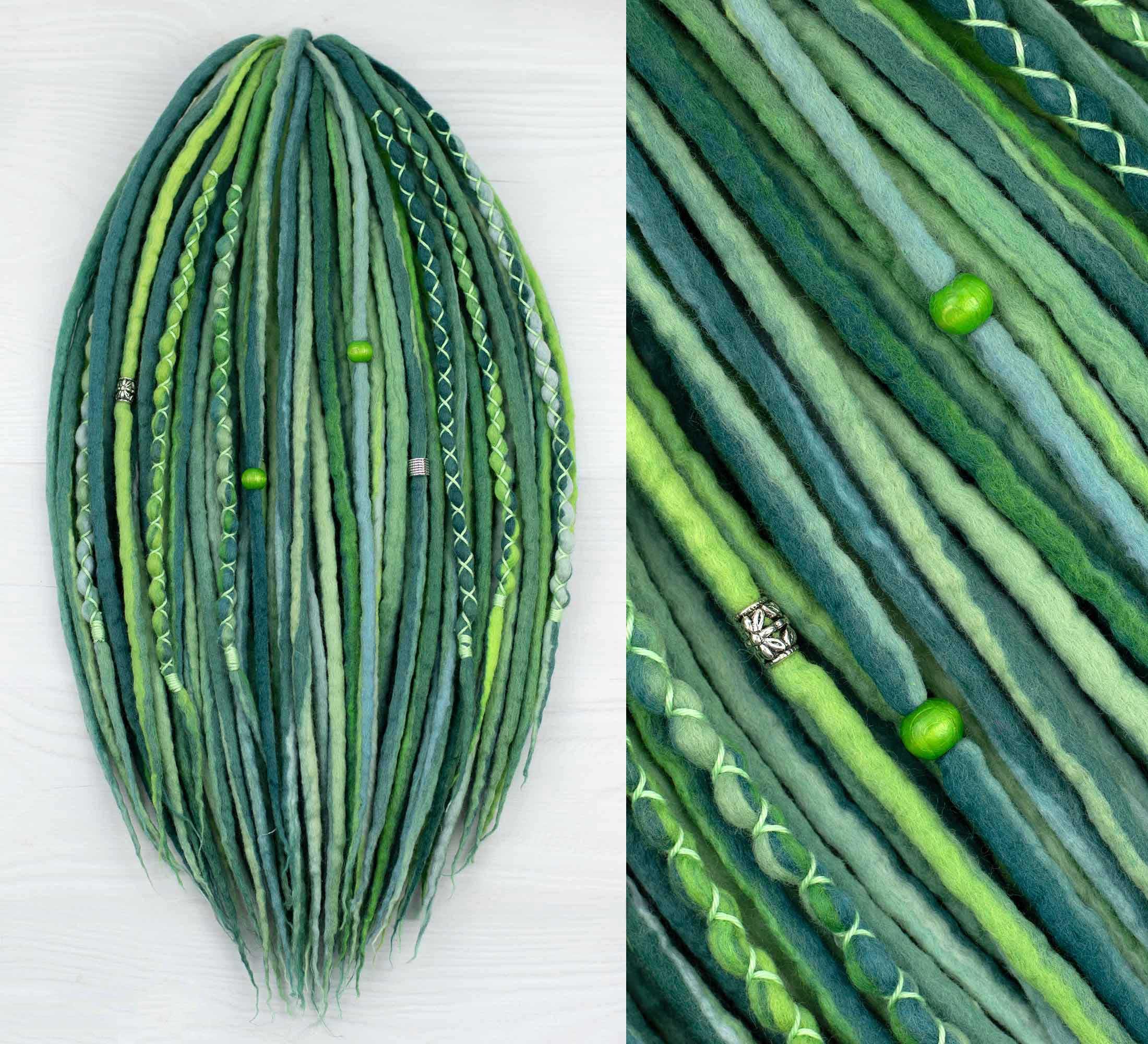 Wearing green fairy wool dreadlocks combines positive vibrations with the warmth of wool. Handcrafted from extra fine wool fibers, the dreadlocks offer an experience that soothes the senses and uplifts the soul. The vibrant green color evokes a sense of harmony, growth and renewal, and infuses you with a refreshing energy reminiscent of lush meadows and blooming forests.
