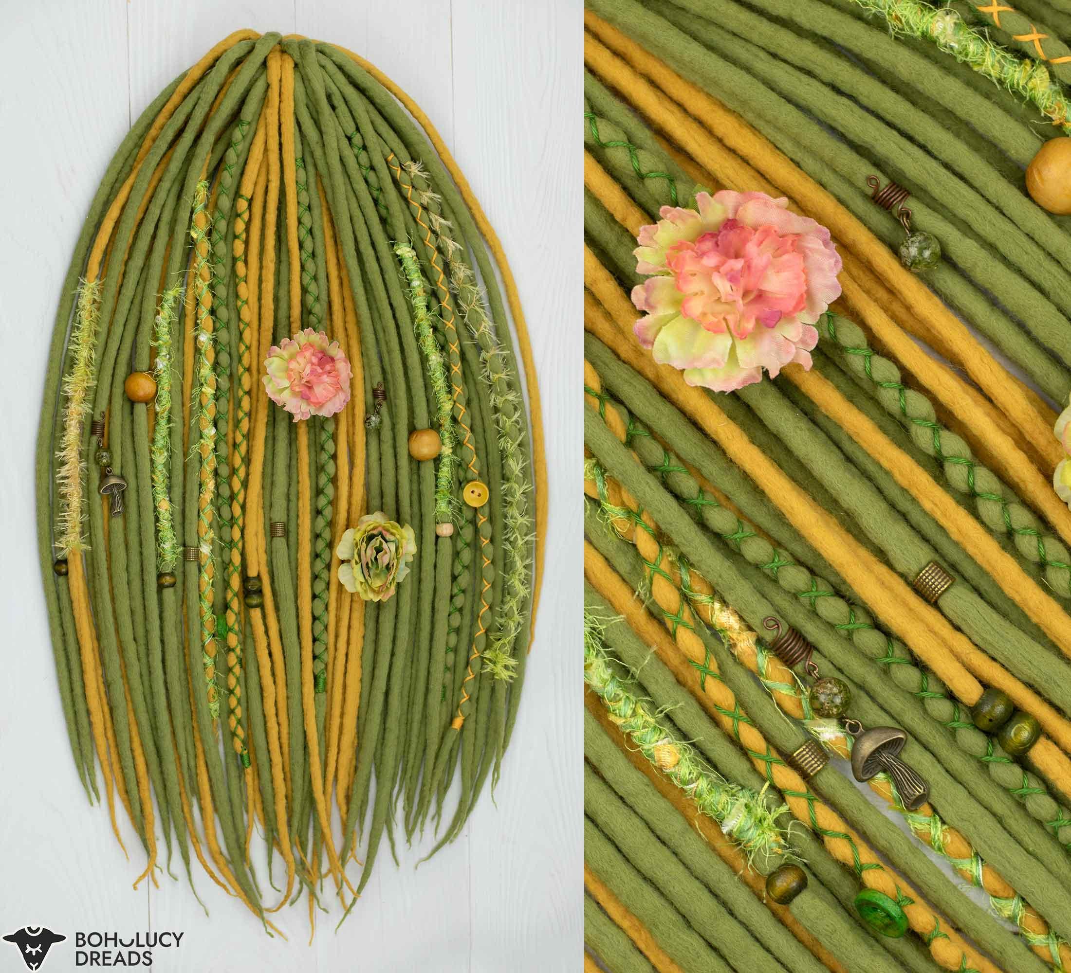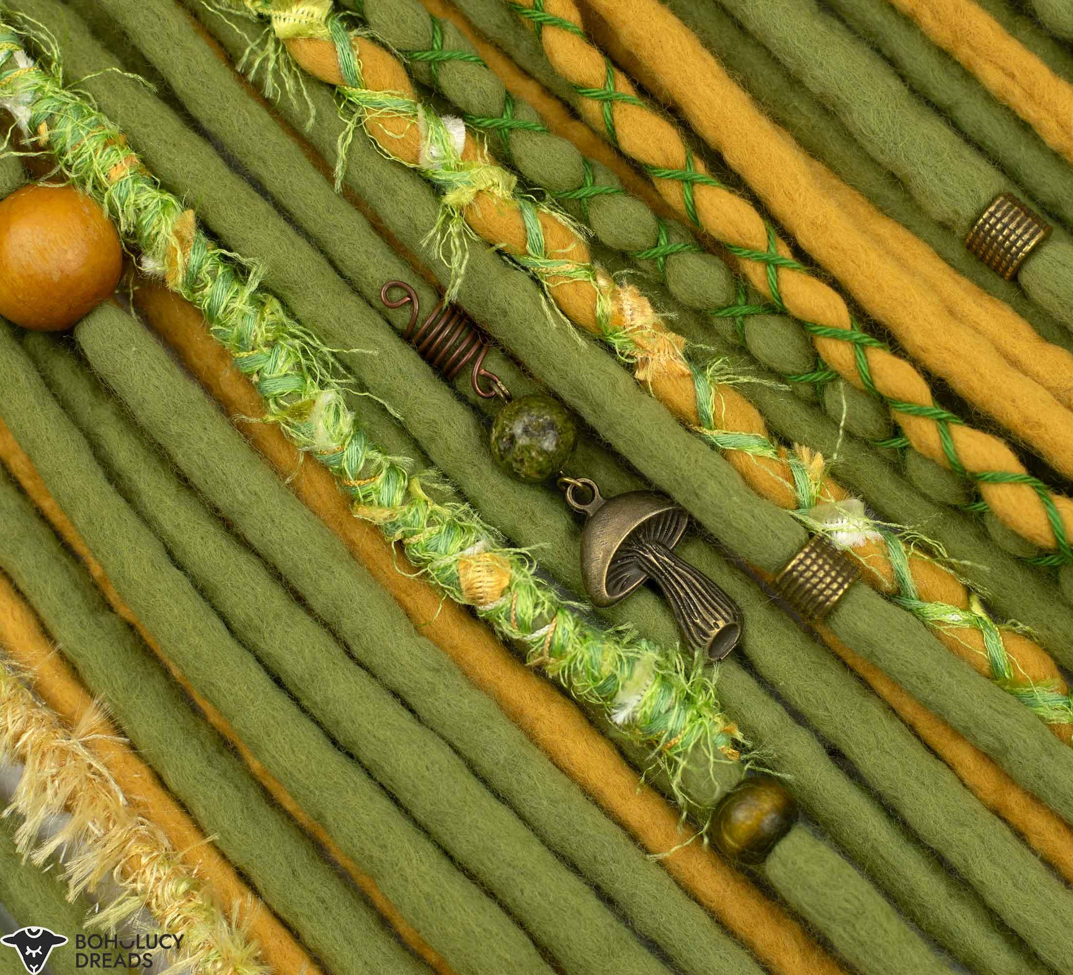 This fairy-styled wool dread set embraces a connection to nature and includes natural and earthy elements. Such as beads with unakite crystal, silk flowers and textured yarn decoration.