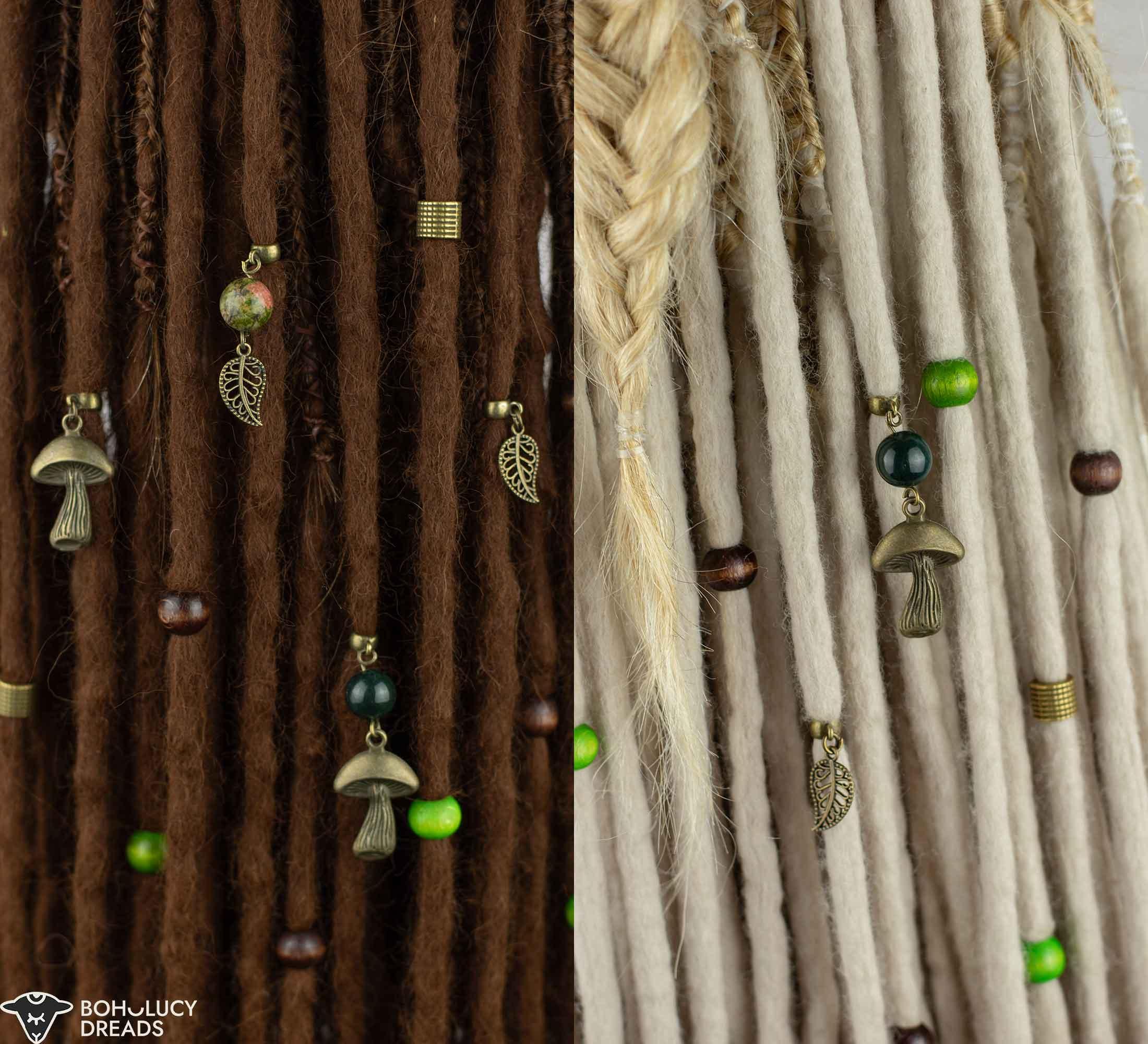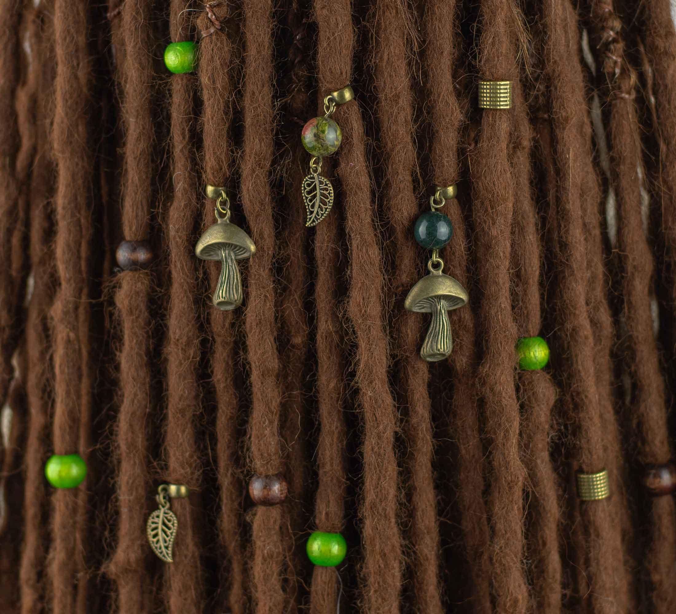 Imagine adding these forest-themed beads to your wool dreadlocks, you can enhance the natural beauty of your hair and create a magical and mesmerizing visual effect that celebrates your connection to nature. By embedding the Unakite and Hawk's Eye stones in your dreadlocked bead set, you can invite their unique energies into your life and connect with their symbolism.