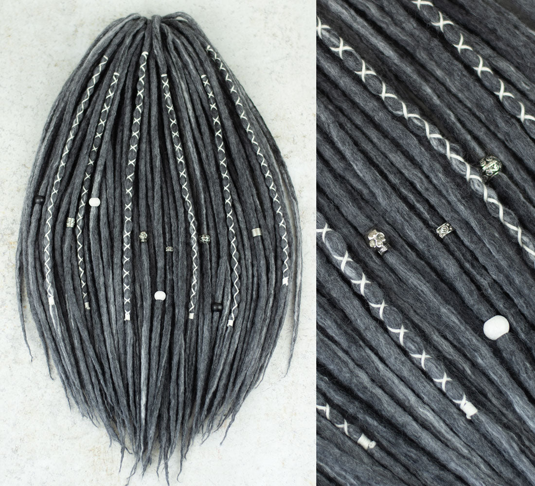 Handmade from extra soft merino wool. These breathable, non-itchy and comfortable dreadlocks are available in sophisticated shades of black and grey. Each set includes some beautifully decorated dreadlocks to give your hairstyle a unique look.