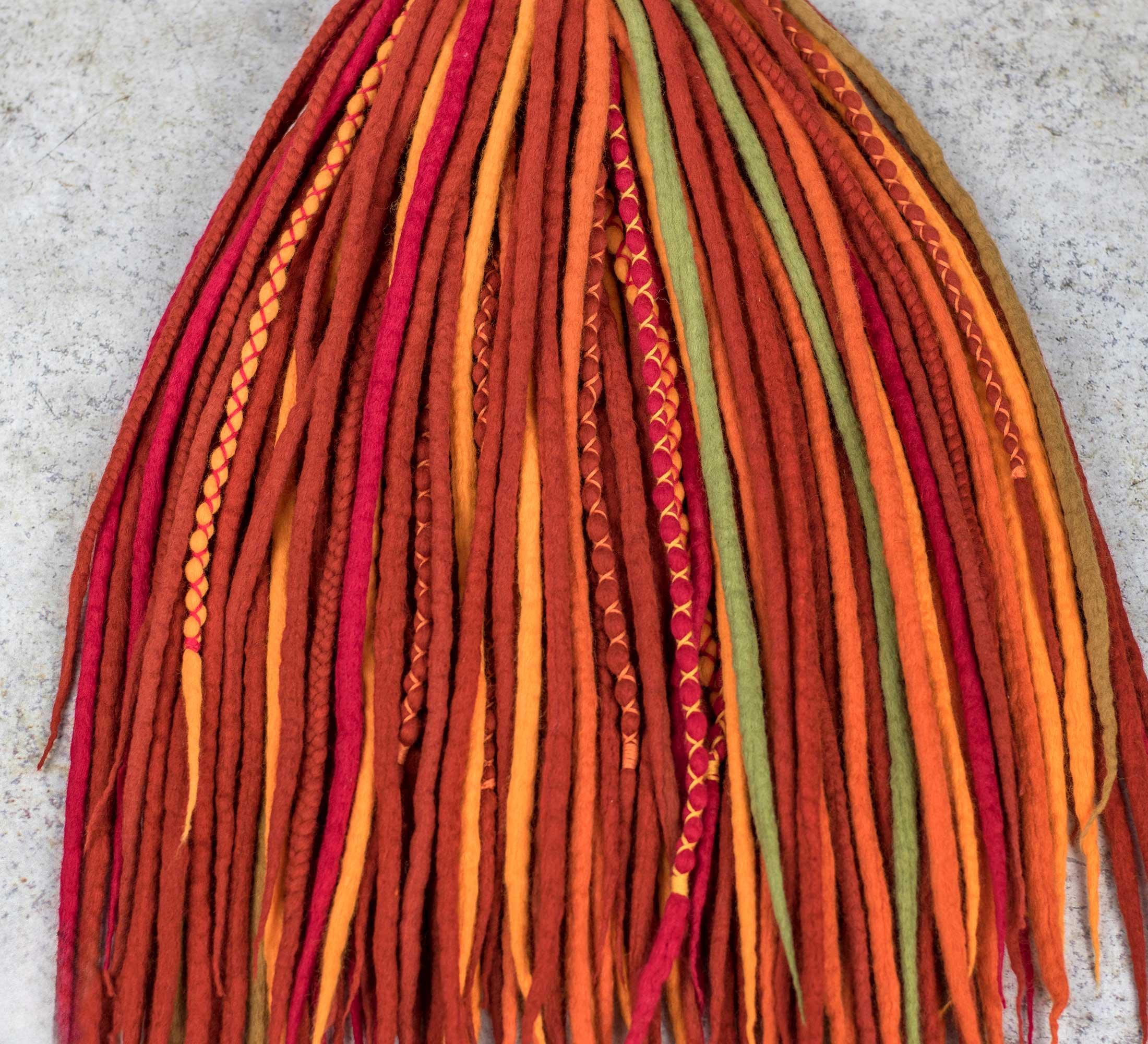 The mill dyed wool and yarn is toxic free, and complies with the OEKO-TEX 100 and GOTS requirements. We use high quality mulesing free extra fine merino wool for dreads. The dreadlocks are decorated with cotton yarn. We make the dreads with wet felting technique.